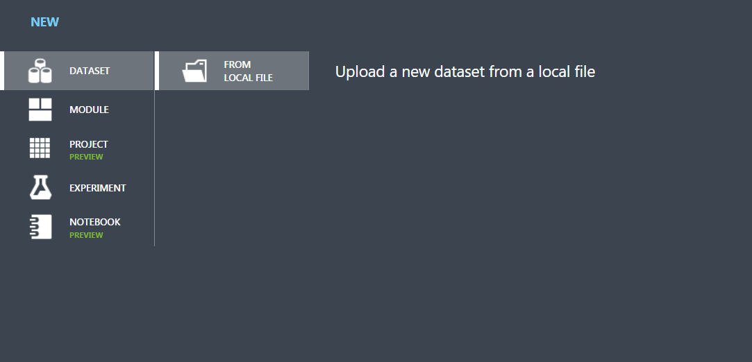 When you sign in to the studio you will see tabs on the left screen and “+New” button on the bottom of the screen. To upload your datasets to the studio click “+New” button. Upload both test and train datasets you downloaded.