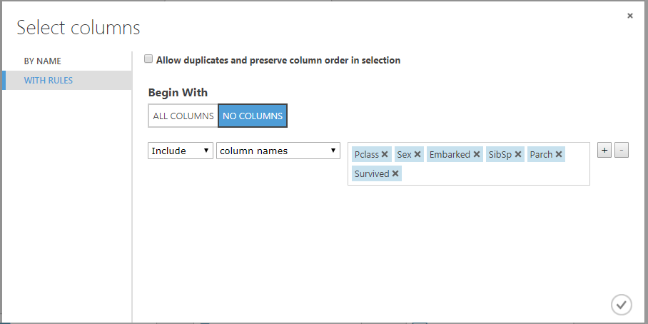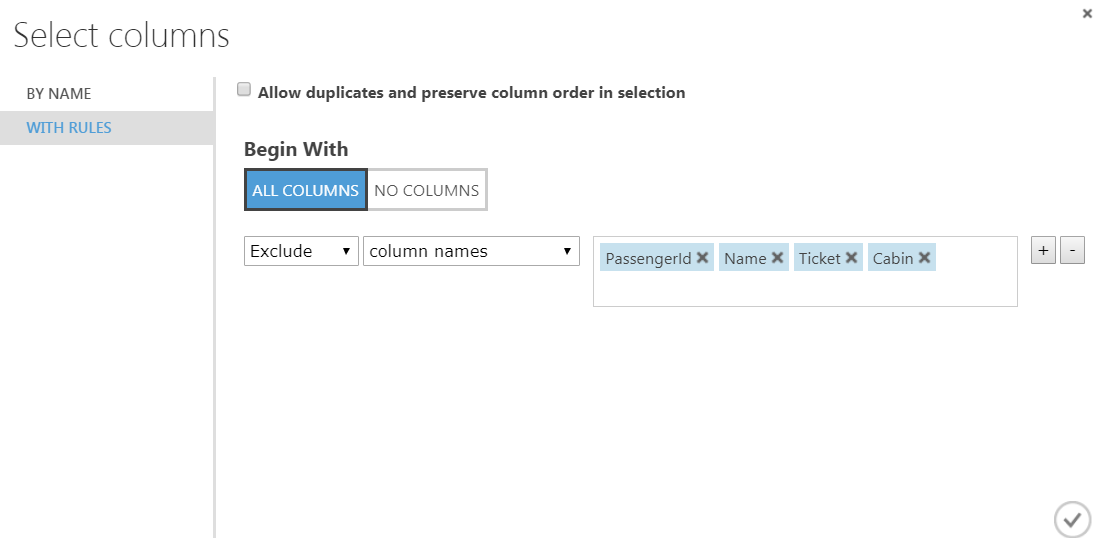 Click on the Select Columns in Dataset and on the right of the screen click the column selector. Under the With Rules tab exclude columns as follow.