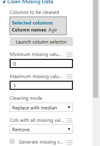 Now if you look at Age column, there is many missing values, since Age is important for our experiement, i want to keep this column and replace its missing values with median. It is pretty easy with “Clean Missing Data” item.