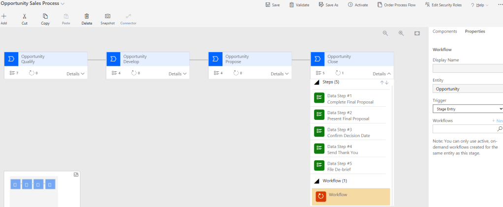 I will use the Opportunity Sales Process BPF that comes built in with CRM. I will create a sync on demand workflow to Update and Validate the record. Sync is needed because we want to show error message in real time. On demand is needed because in order to use the workflow in BPFs, you need to make your workflows on demand.