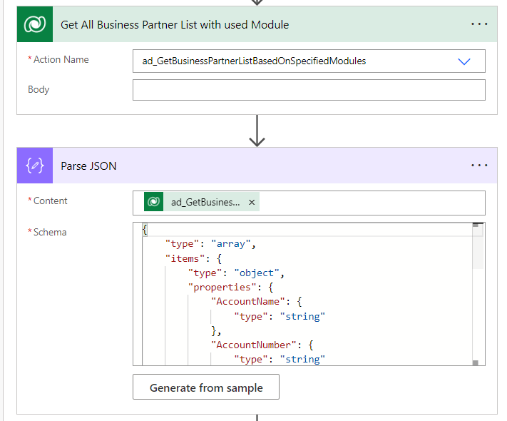 For example in the below picture, I am calling a custom Dynamics 365 Action. That action returns a string output in JSON format. I pass it to the “Parse JSON” action. Note that you have to specify the correct JSON schema here. Because a JSON Schema provides a way to describe the structure and constraints of JSON data, and can be used to validate that data against the schema.