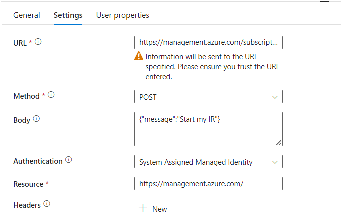 - For URL, enter the following URL for REST API that starts Azure-SSIS IR, replacing