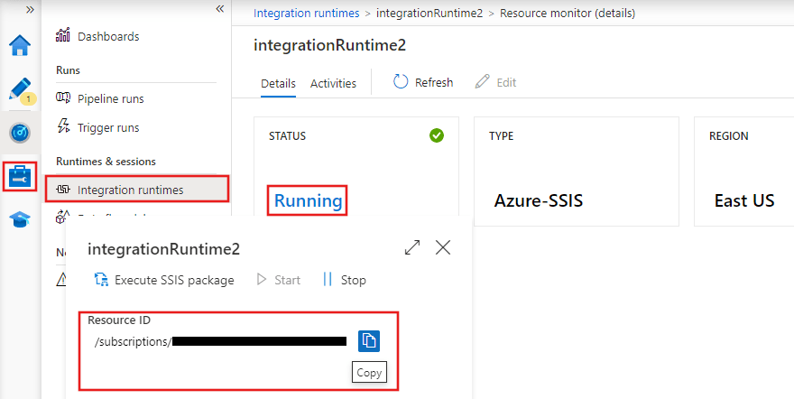 {subscriptionId},{resourceGroupName},{factoryName}, and{integrationRuntimeName}with the actual values for your IR:https://management.azure.com/subscriptions/{subscriptionId}/resourceGroups/{resourceGroupName}/providers/Microsoft.DataFactory/factories/{factoryName}/integrationRuntimes/{integrationRuntimeName}/start?api-version=2018-06-01. Alternatively, you can also copy & paste the resource ID of your IR from its monitoring page on ADF UI/app to replace the following part of the above URL:/subscriptions/{subscriptionId}/resourceGroups/{resourceGroupName}/providers/Microsoft.DataFactory/factories/{factoryName}/integrationRuntimes/{integrationRuntimeName}