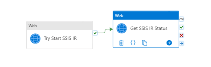 - The Start SSIS IR Until activity contains Try Start SSIS IR and Get SSIS IR Status Web activities.