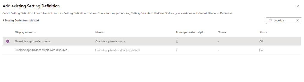 - In the Search box, type “Override,” select “Override app header color,” then click “Next,” and finally, choose “Add.”