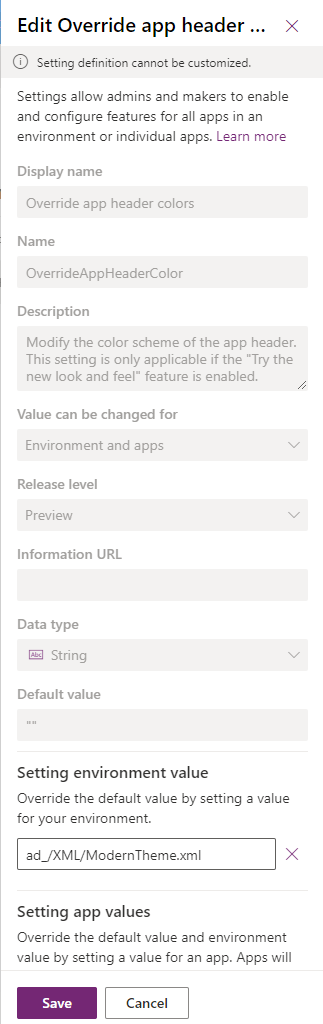 - In the Edit Override app header color properties pane on the right, opt for “Setting environment value” and input the unique name of your previously created web resource.