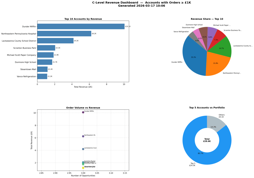 - Bottom right: Donut chart comparing the top 5 accounts against the rest of the portfolio. The total pipeline value sits in the centre of the donut.